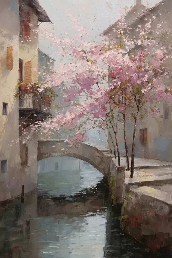 Poster romantico paesaggio urbano con un albero in fiore nello stile della pittura a olio Nr f47127