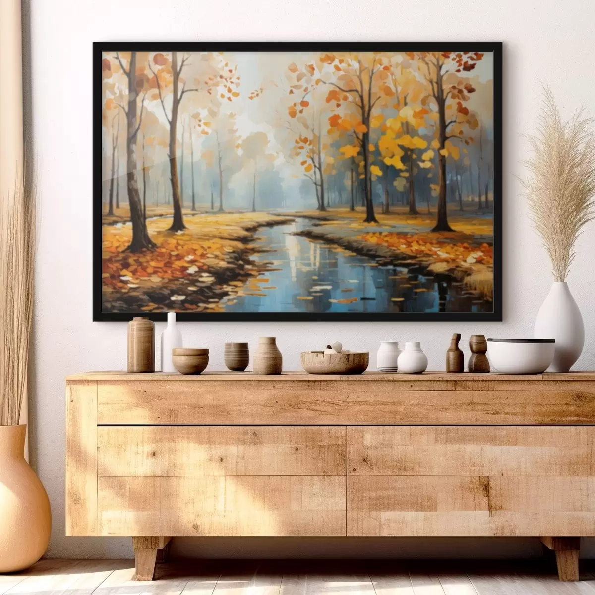 Poster Foresta autunnale con un ruscello e foglie gialle f47278