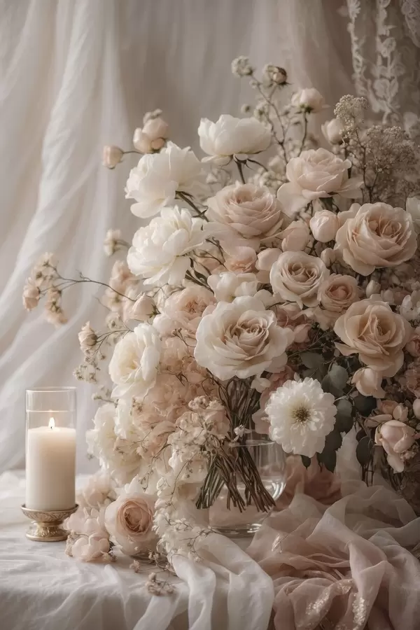 Poster Fiori color crema accanto a una candela accesa Nr f47281