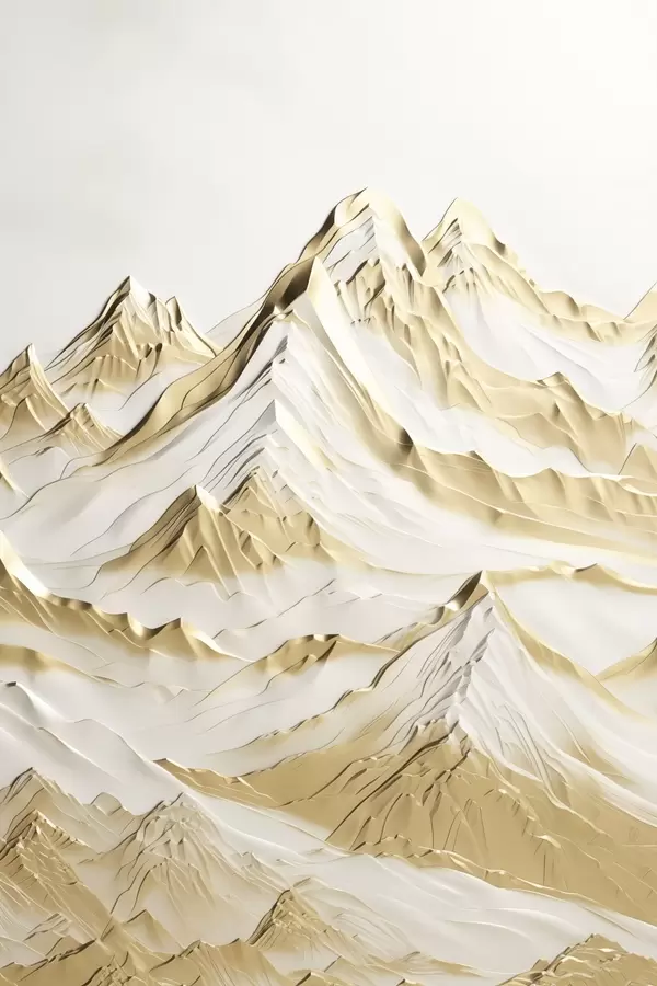 Poster Un paesaggio di montagne innevate di colore giallo con cime aguzze e valli profonde sotto un cielo luminoso Nr f47420