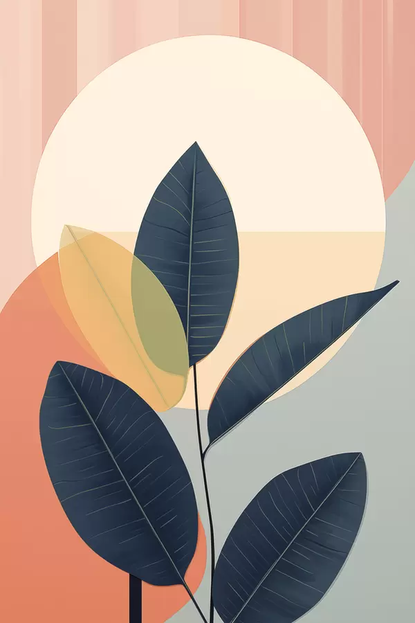 Poster Foglie scure su uno sfondo di forme astratte color pesca e grigio con un grande cerchio giallo pallido Nr f47424