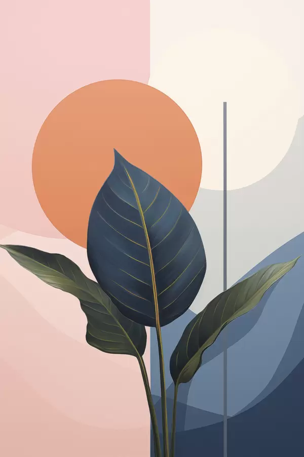 Poster Foglie scure su uno sfondo di forme astratte color pesca e grigio con cerchio arancione Nr f47425