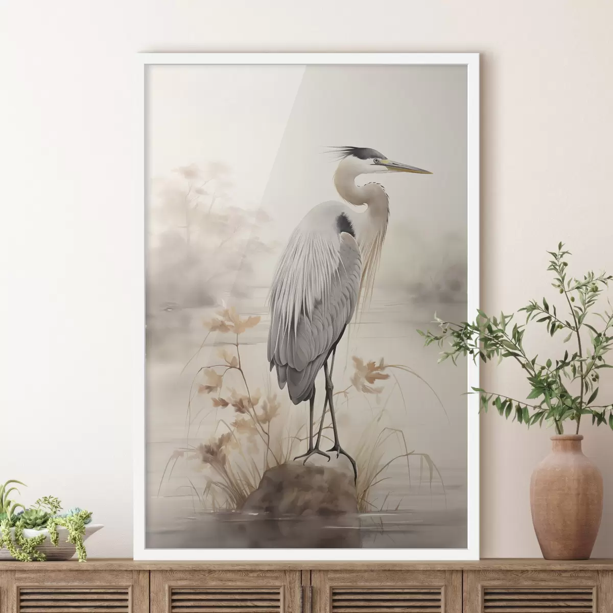 Poster Un airone è in piedi su una roccia in un lago con erba alta e alberi sullo sfondo. f47426