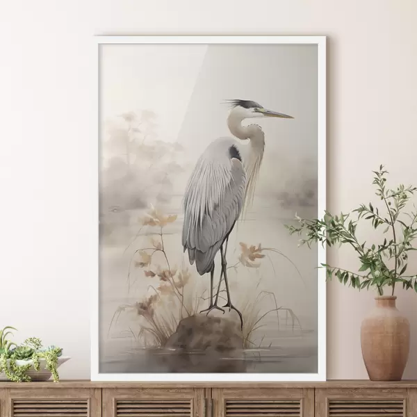 Poster Un airone è in piedi su una roccia in un lago con erba alta e alberi sullo sfondo. Nr f47426