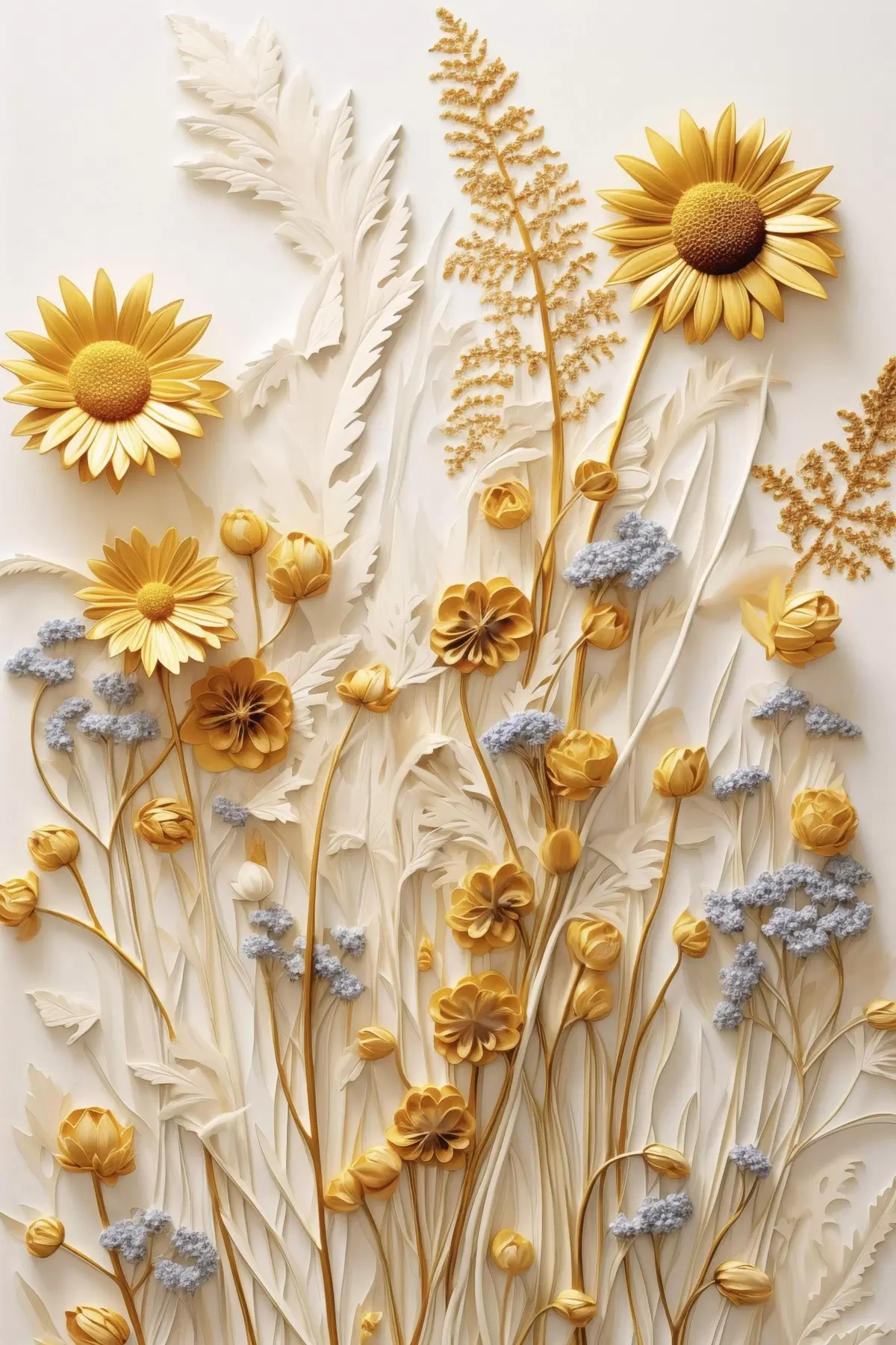Poster Una collezione materica di margherite gialle e bianche con erbe secche e rametti di lavanda su sfondo bianco f47431
