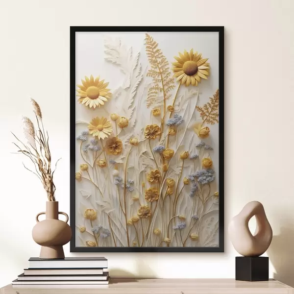 Poster Una collezione materica di margherite gialle e bianche con erbe secche e rametti di lavanda su sfondo bianco Nr f47431
