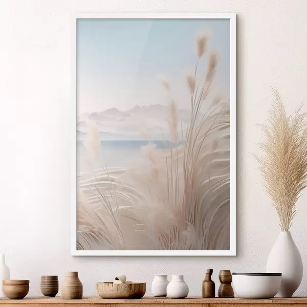 Poster Alta erba della pampa soffice nei toni del beige, con una spiaggia sabbiosa e montagne sullo sfondo Nr f47433