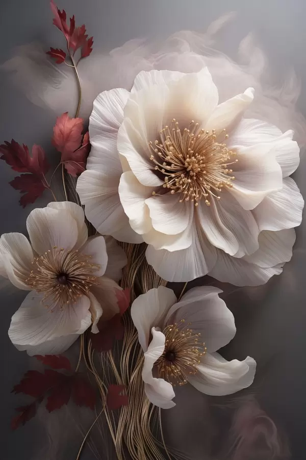 Poster Delicate peonie dai petali sottili e vaporosi, circondate da foglie rosso scuro su uno sfondo astratto f47434