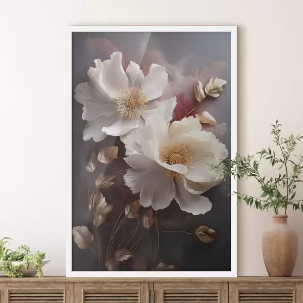 Poster Delicate peonie con petali sottili e vaporosi, circondate da foglie rosso scuro e gialle su uno sfondo astratto. Nr f47435