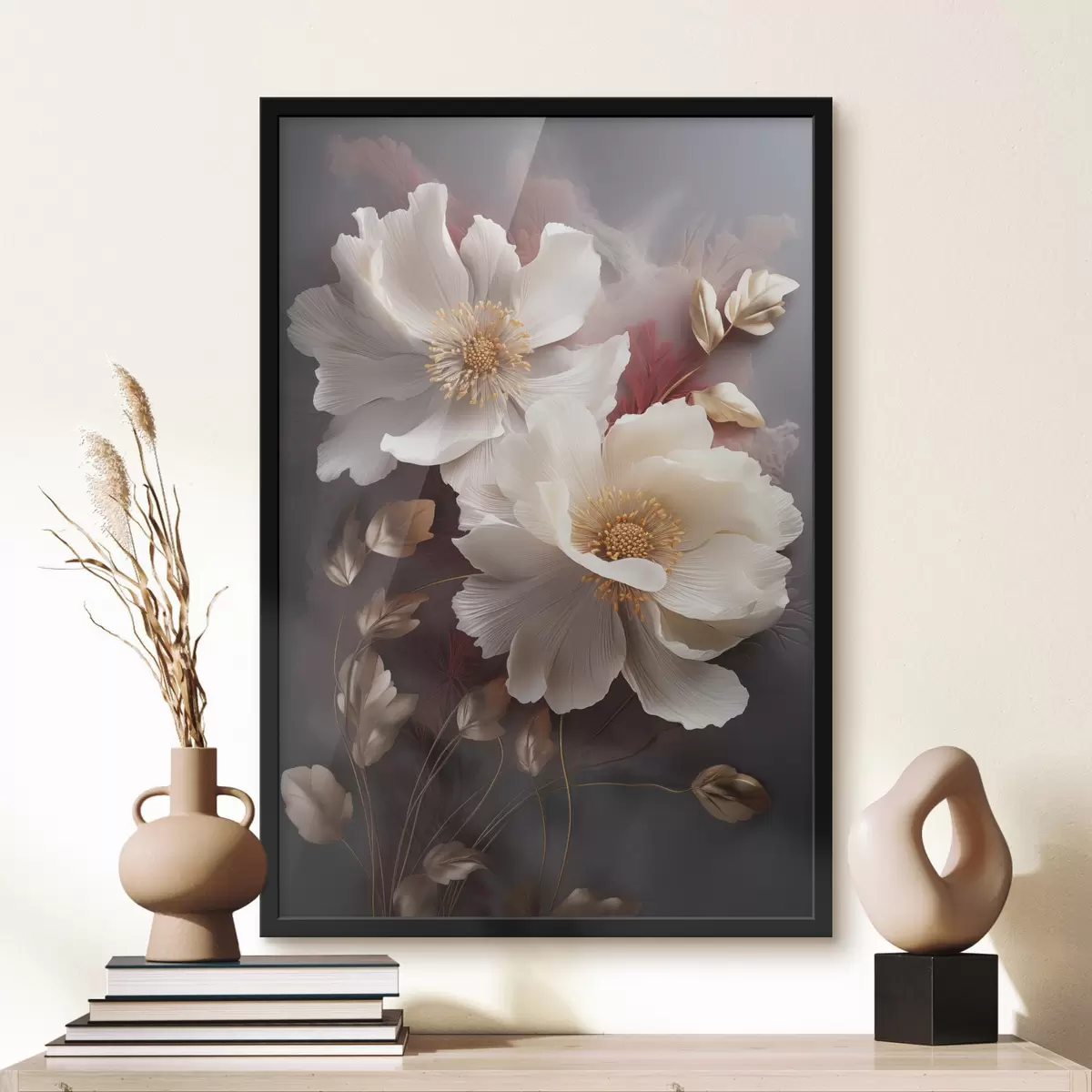 Poster Delicate peonie con petali sottili e vaporosi, circondate da foglie rosso scuro e gialle su uno sfondo astratto. f47435