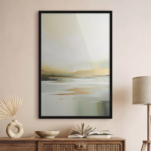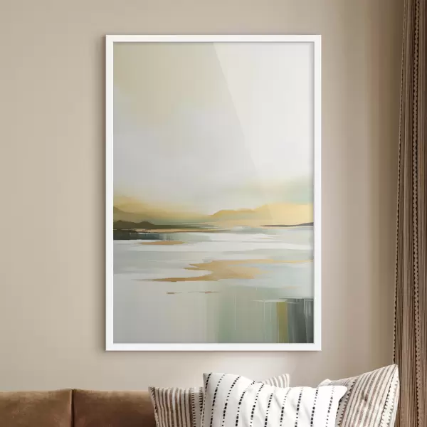 Poster Paesaggio astratto con tonalità gialle e verdi, acqua che riflette il cielo e le montagne lontane, cielo pallido e nebbioso Nr f47439