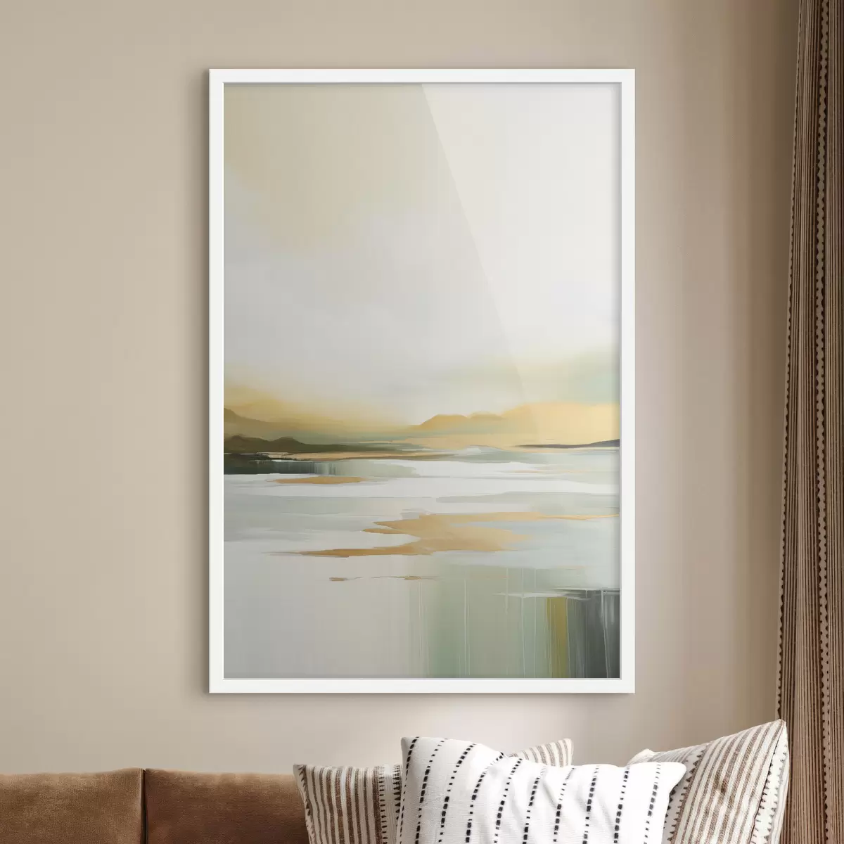 Poster Paesaggio astratto con tonalità gialle e verdi, acqua che riflette il cielo e le montagne lontane, cielo pallido e nebbioso f47439