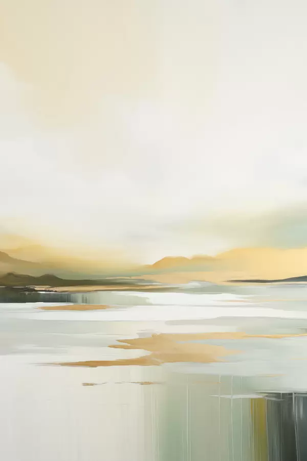 Poster Paesaggio astratto con tonalità gialle e verdi, acqua che riflette il cielo e le montagne lontane, cielo pallido e nebbioso Nr f47439