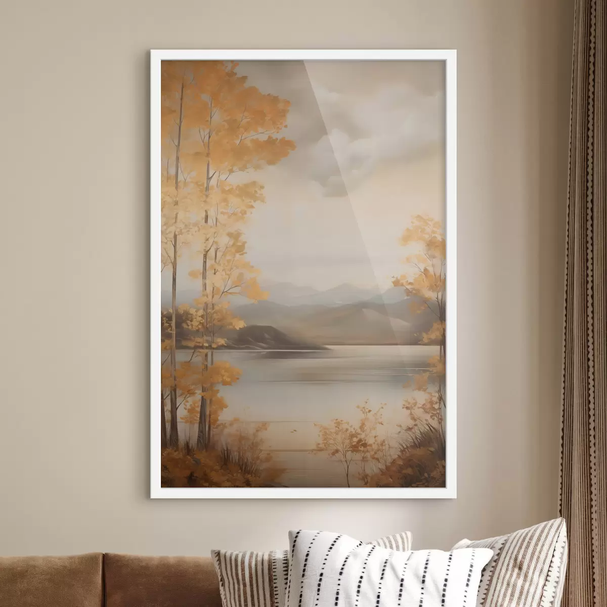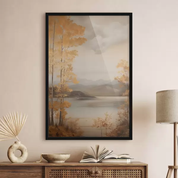 Poster Alberi autunnali dalle foglie arancioni incorniciano un lago tranquillo con montagne lontane sotto un cielo nuvoloso. f47441