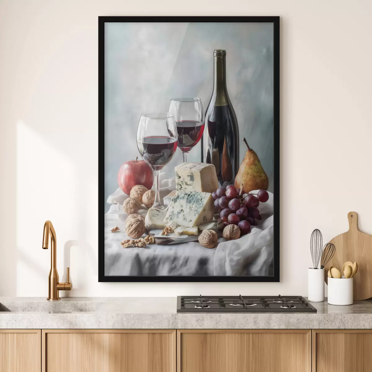 Poster natura morta con vino, formaggio e noci Nr f47686