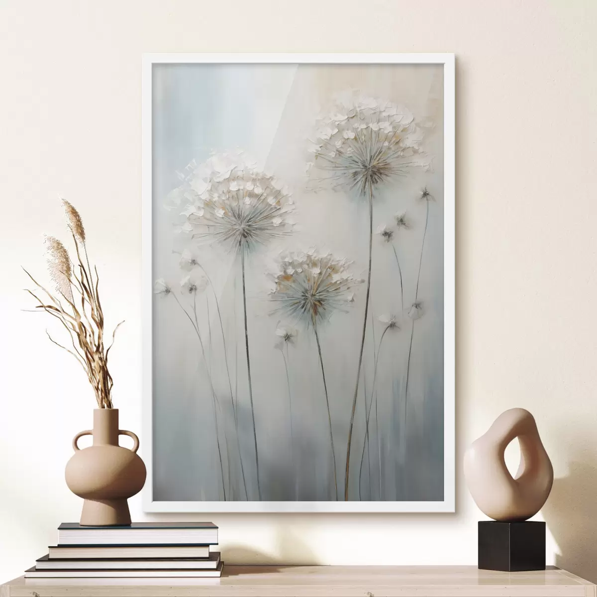 Poster Stile pittorico materico di denti di leone su uno sfondo morbido blu e bianco f47855