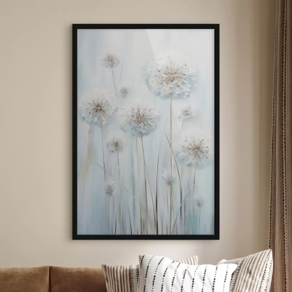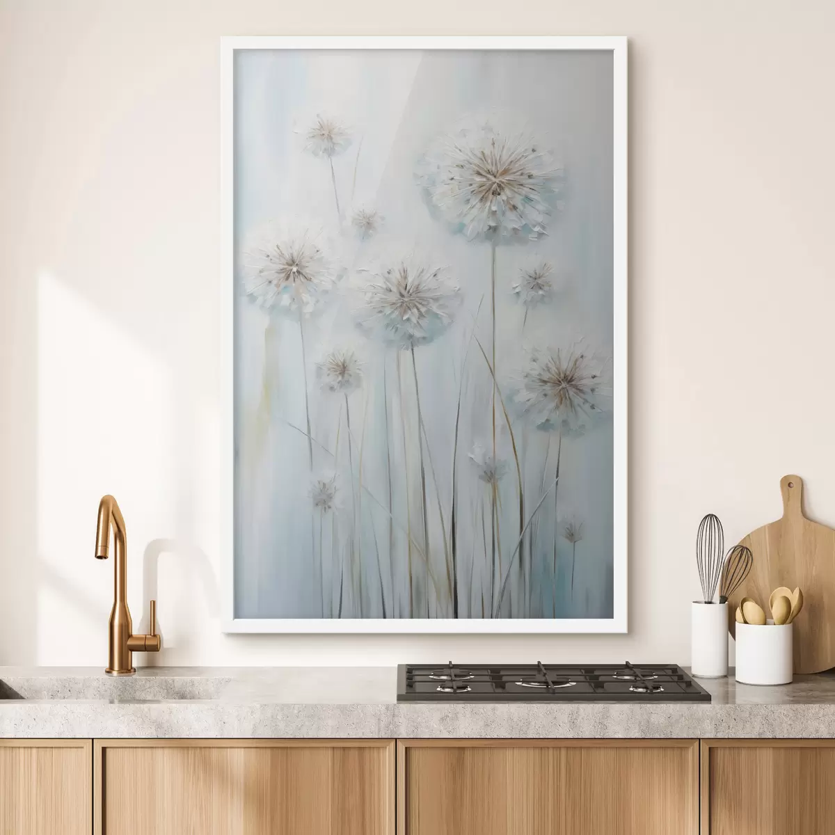Poster Stile pittorico materico di denti di leone su uno sfondo morbido blu e bianco Nr f47856