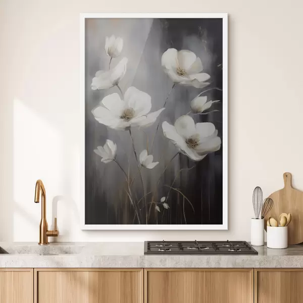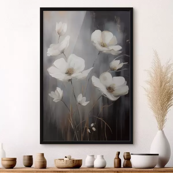 Poster Fiori bianchi con centro marrone e steli sottili su uno sfondo scuro e strutturato Nr f47858