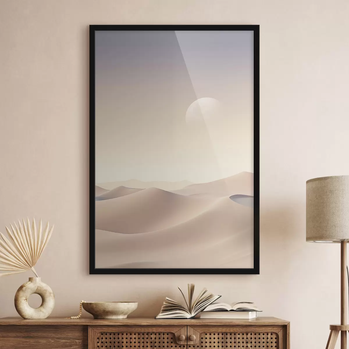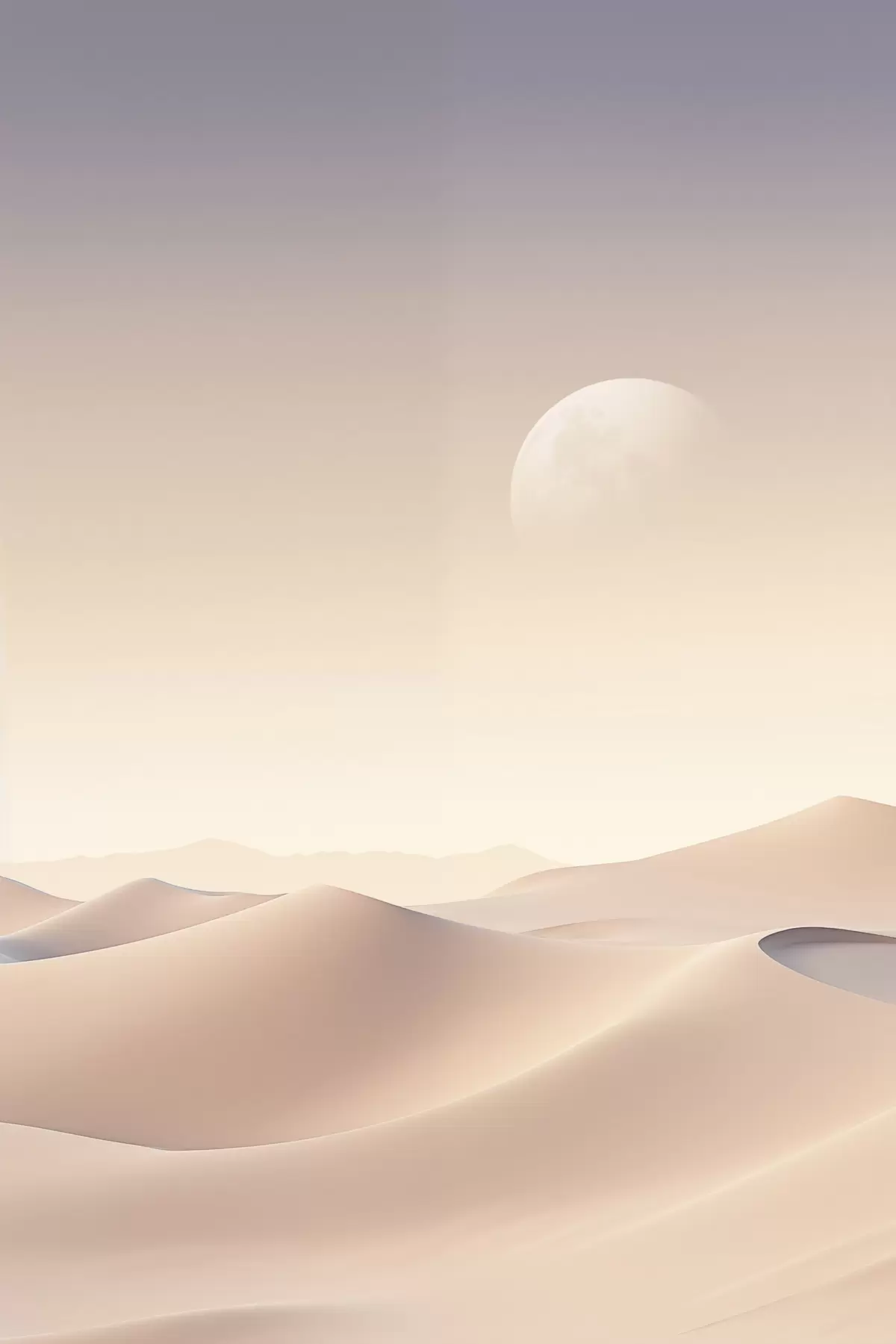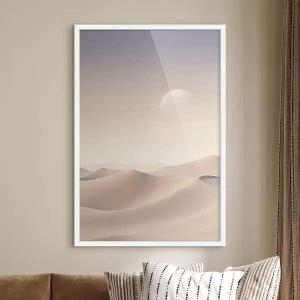 Poster Un paesaggio desertico con dune di sabbia ondulate sotto un cielo dai colori tenui, montagne lontane sullo sfondo Nr f47866