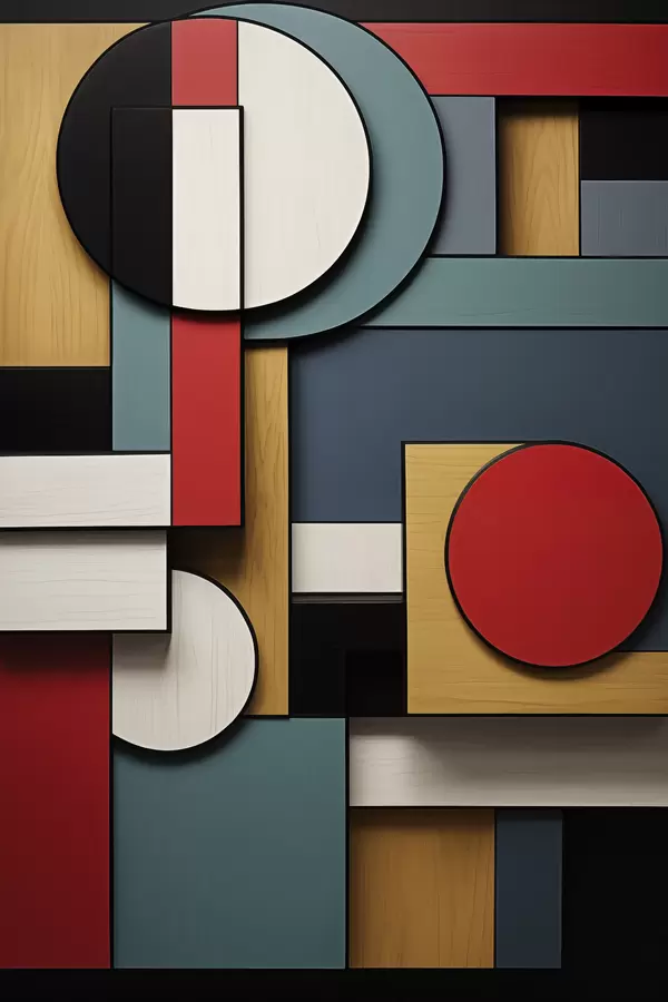 Poster Composizione geometrica astratta con imitazione della texture del legno, rettangoli e cerchi rossi, neri, bianchi e verde acqua Nr f47875