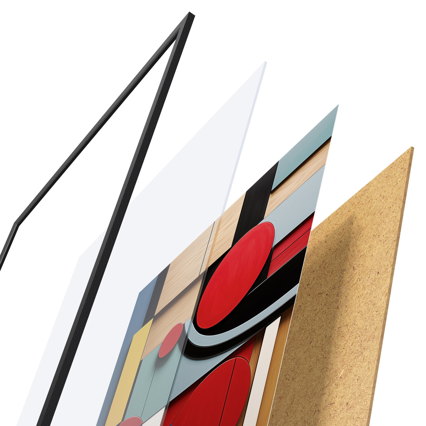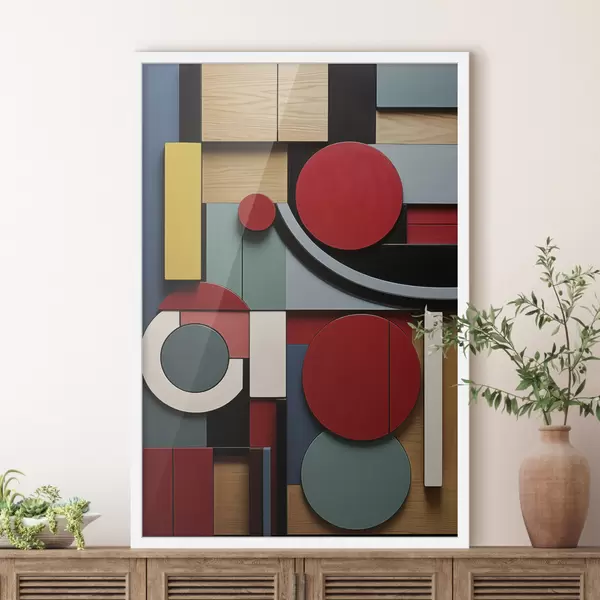 Poster Composizione geometrica astratta con imitazione della texture del legno, rettangoli e cerchi rossi, neri, bianchi e verde acqua Nr f47876