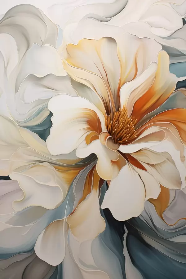 Poster Fiore astratto di grandi dimensioni con petali bianchi, arancioni e verde acqua, sfondo strutturato Nr f47877