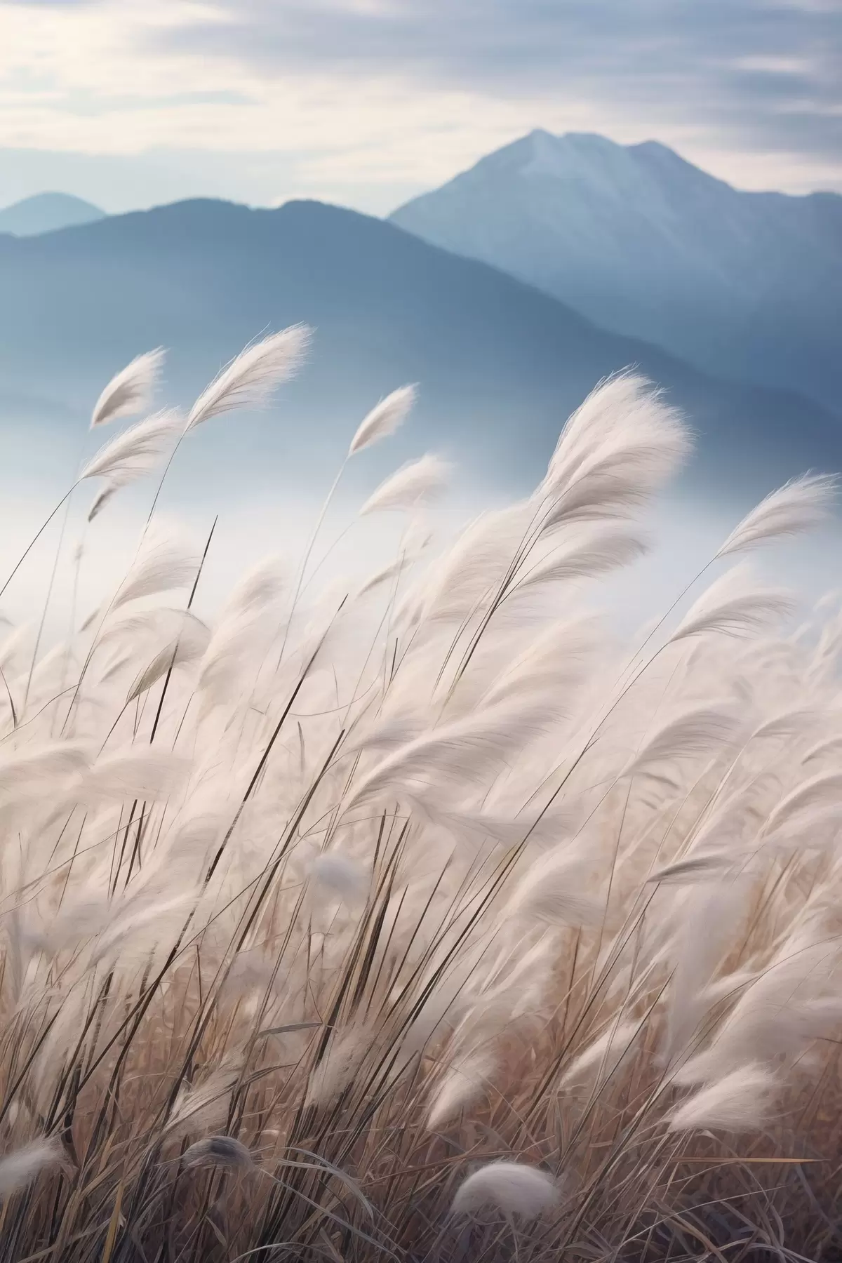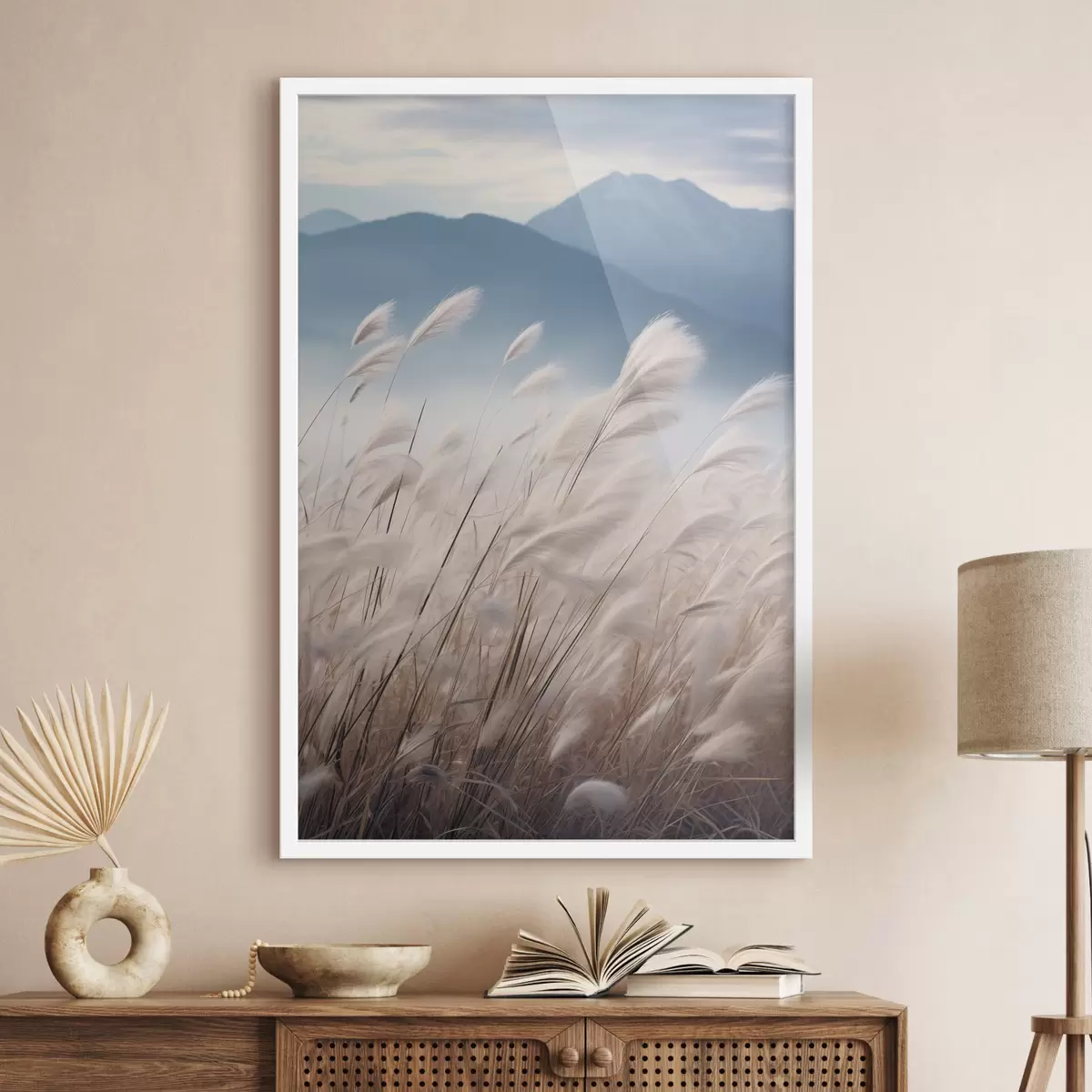 Poster Alta erba della pampa bianca che ondeggia al vento con morbide montagne blu sullo sfondo Nr f47879