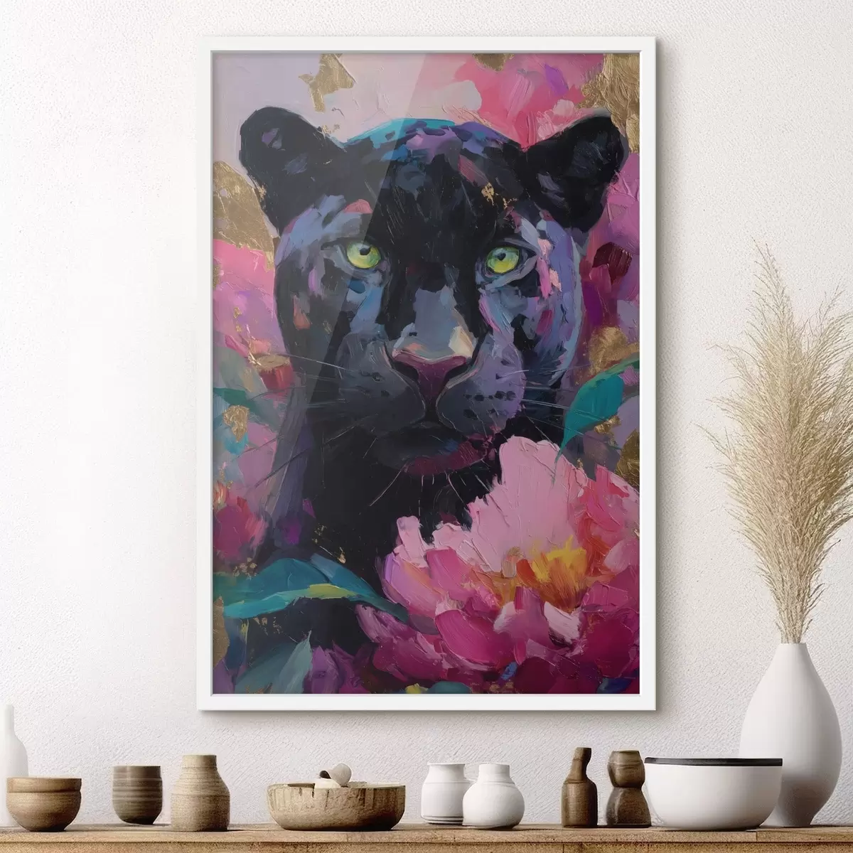Poster pantera nera tra le peonie f47935