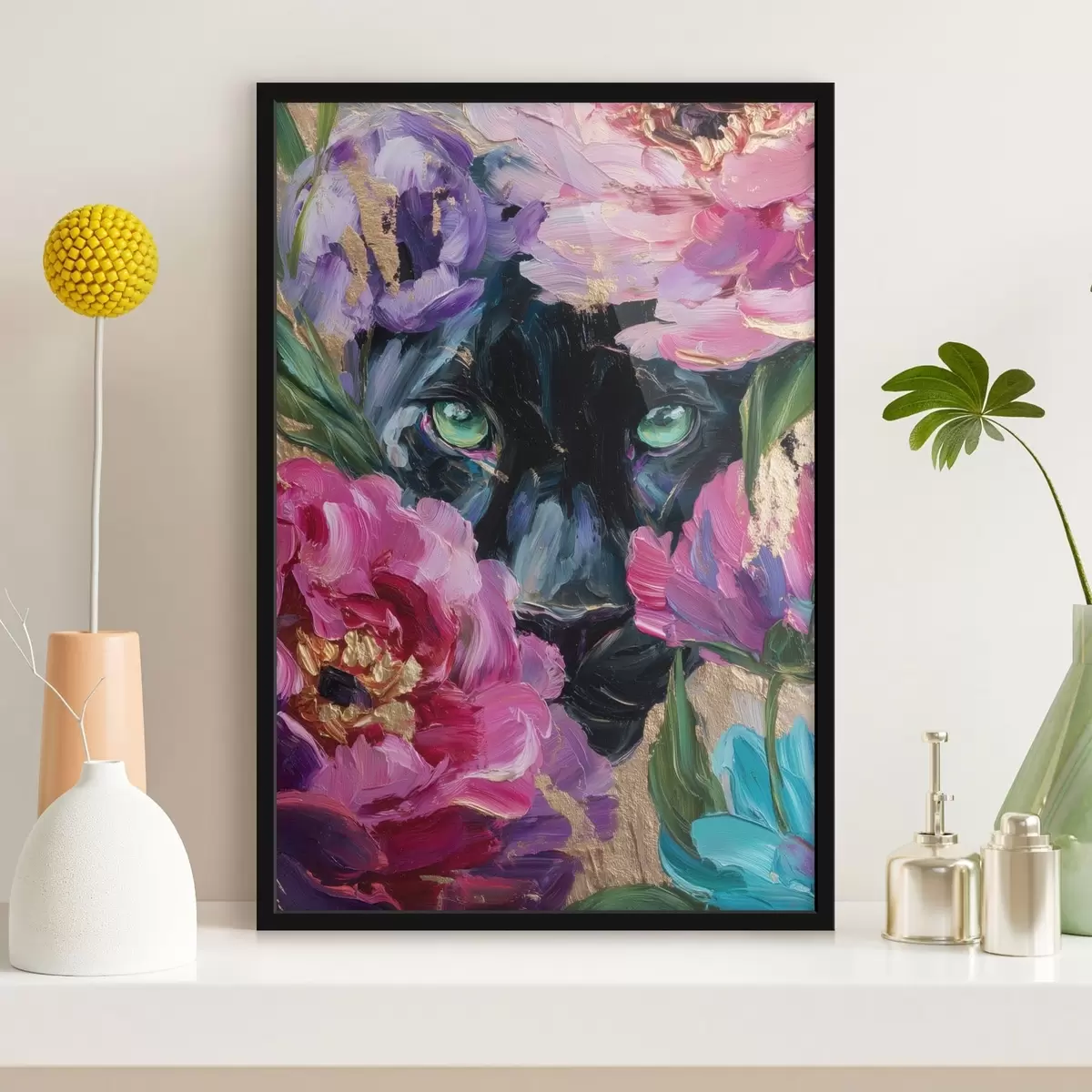 Poster una pantera nera fa capolino tra le peonie f47936
