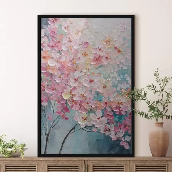 Poster Ramo con fiori rosa su sfondo blu in stile pittura a olio Nr f47987