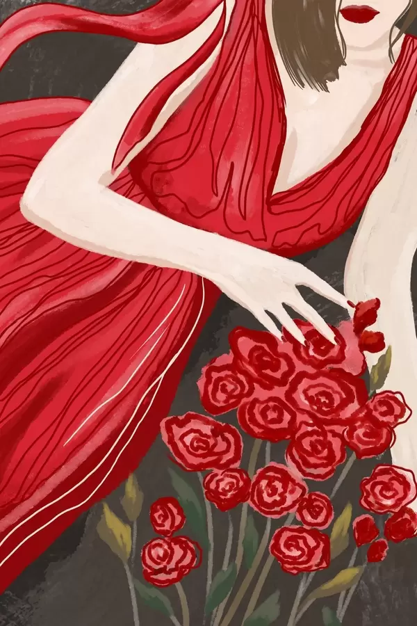 Poster Donna in abito rosso con bouquet di rose f48026
