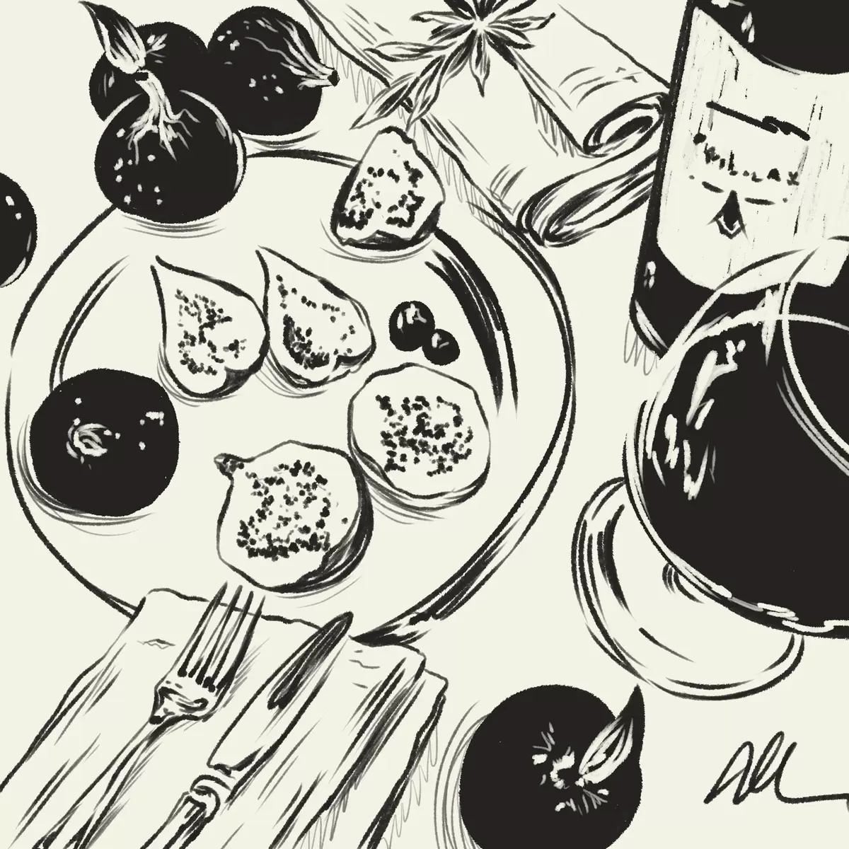 Poster Schizzo in bianco e nero di un tavolo con frutta e un bicchiere Nr f48030