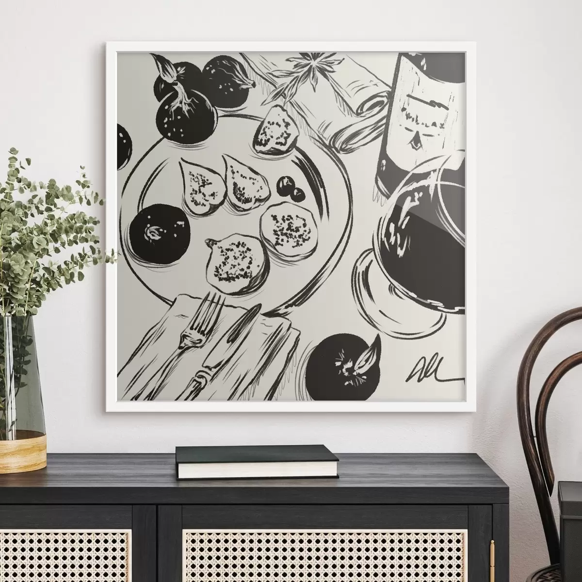 Poster Schizzo in bianco e nero di un tavolo con frutta e un bicchiere f48030