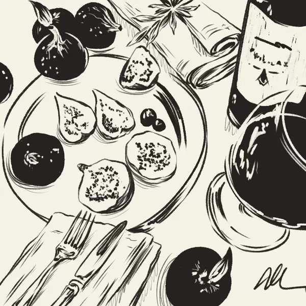 Poster Schizzo in bianco e nero di un tavolo con frutta e un bicchiere f48030