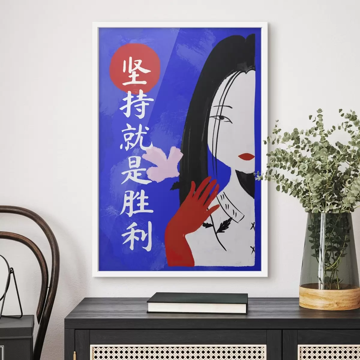 Poster Ritratto stilizzato di una donna su sfondo blu con testo f48032