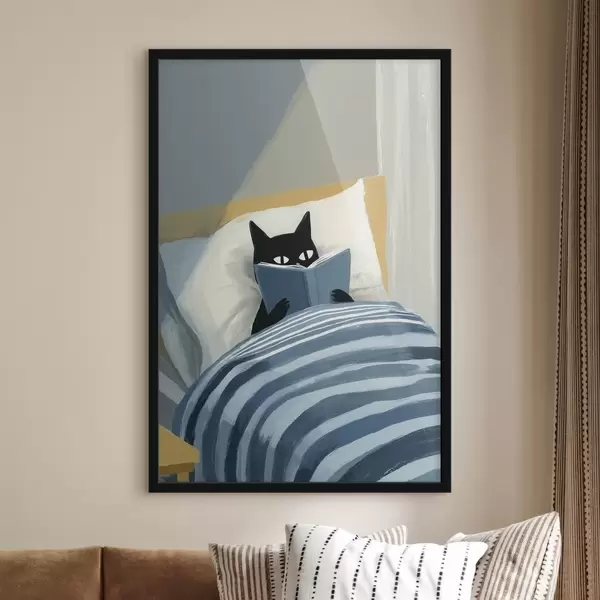 Poster illustrazione minimalista di un gatto nero che legge un libro a letto Nr f48117