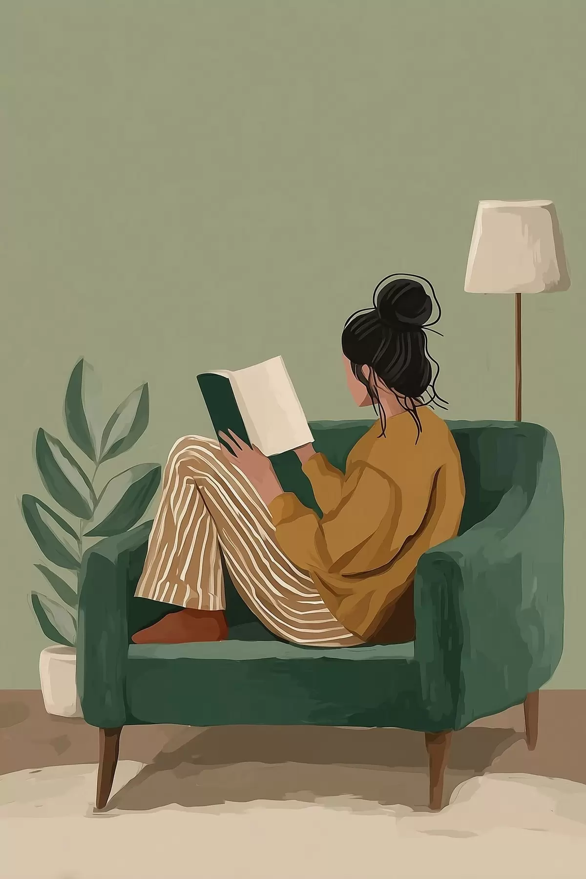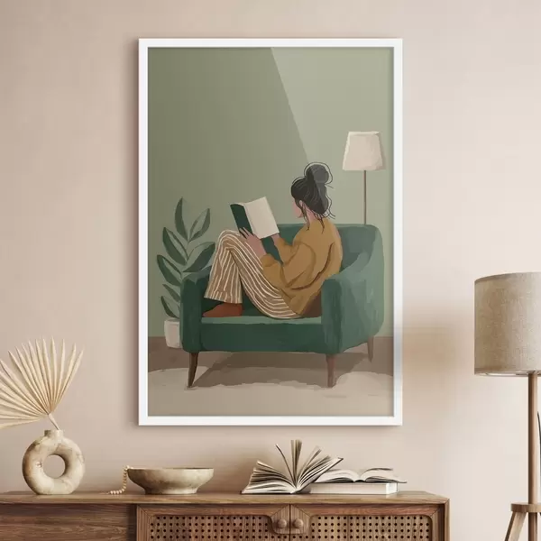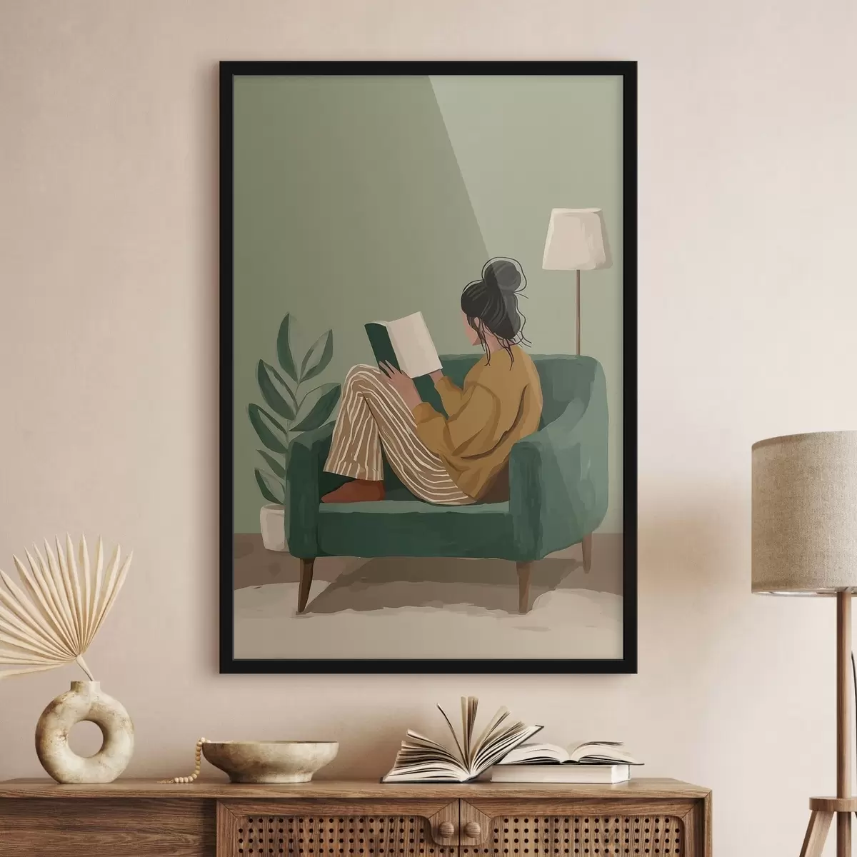 Poster illustrazione minimalista e accogliente di una donna seduta su una poltrona mentre legge Nr f48118