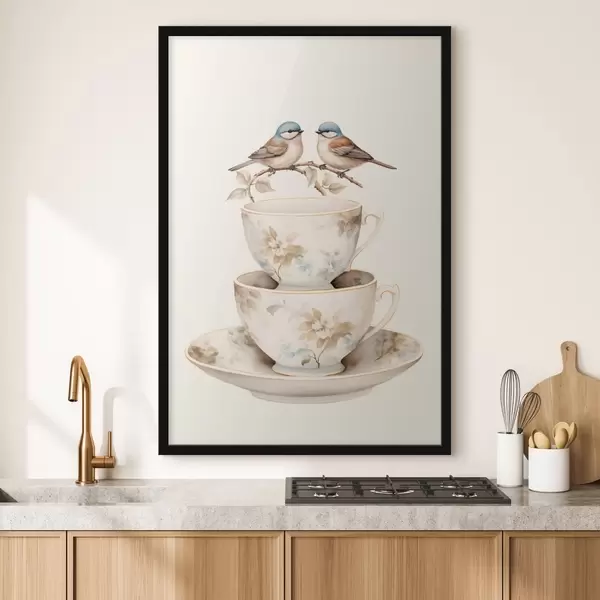 Poster Due uccellini su un ramo sopra delle tazze da tè Nr f48347