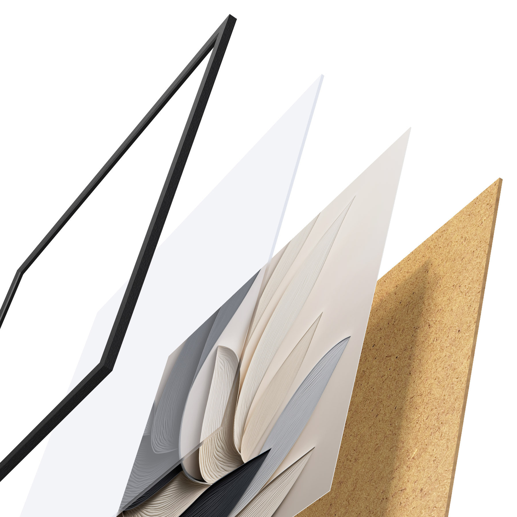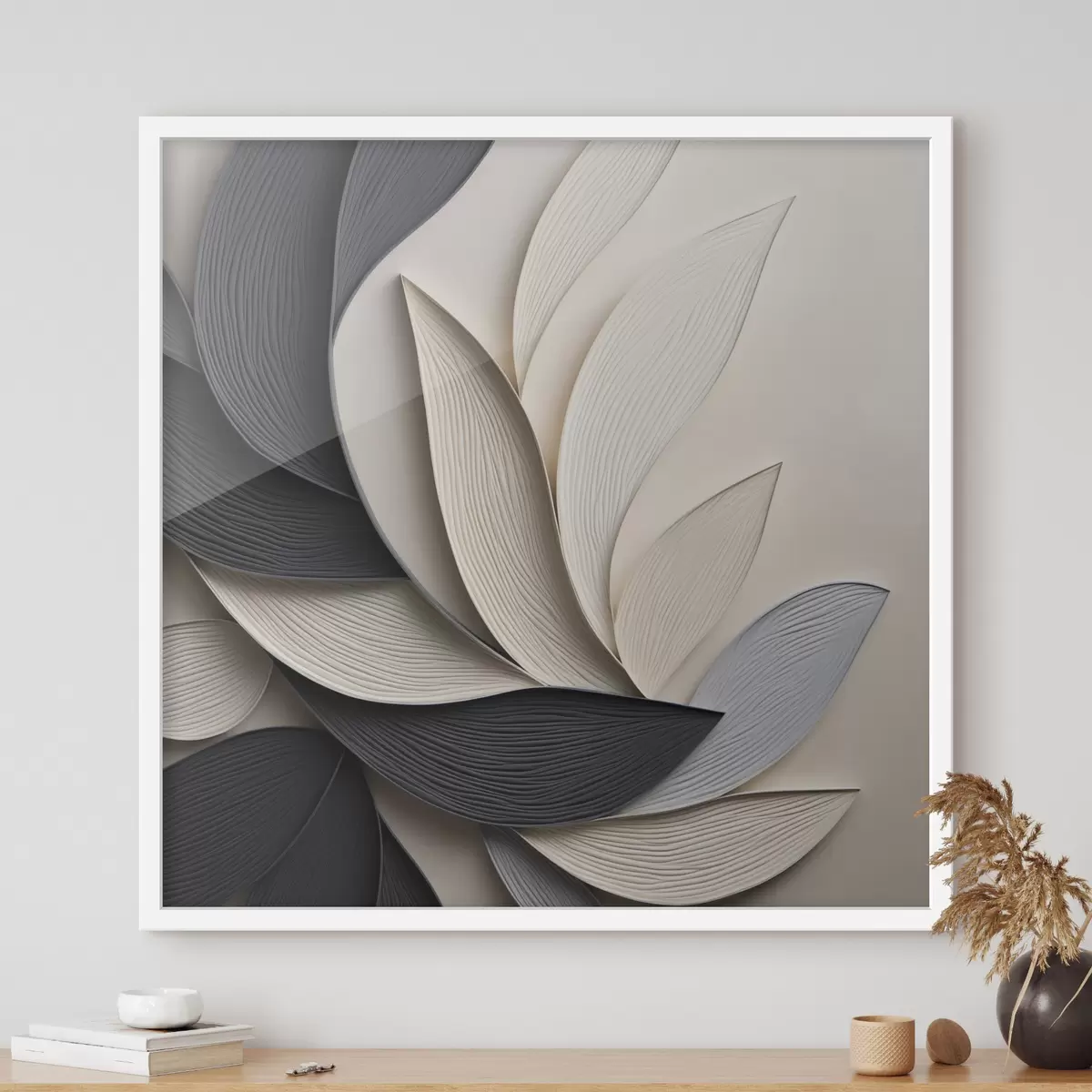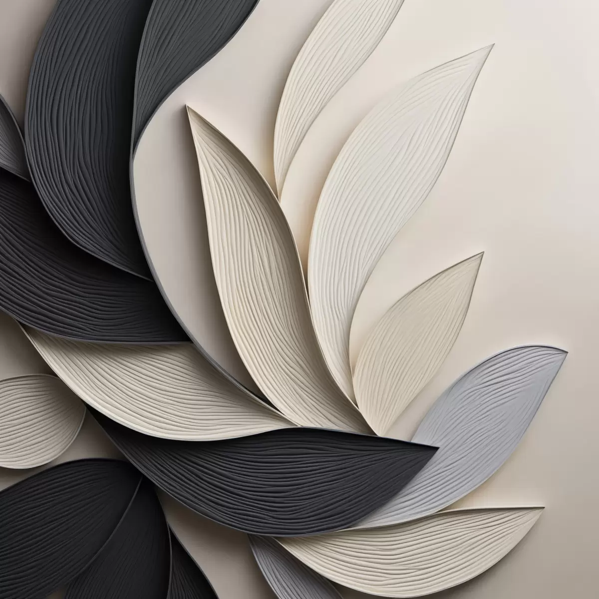 Poster Composizione astratta di foglie sovrapposte, forme sinuose in nero, bianco e beige, opera d'arte materica Nr f48381