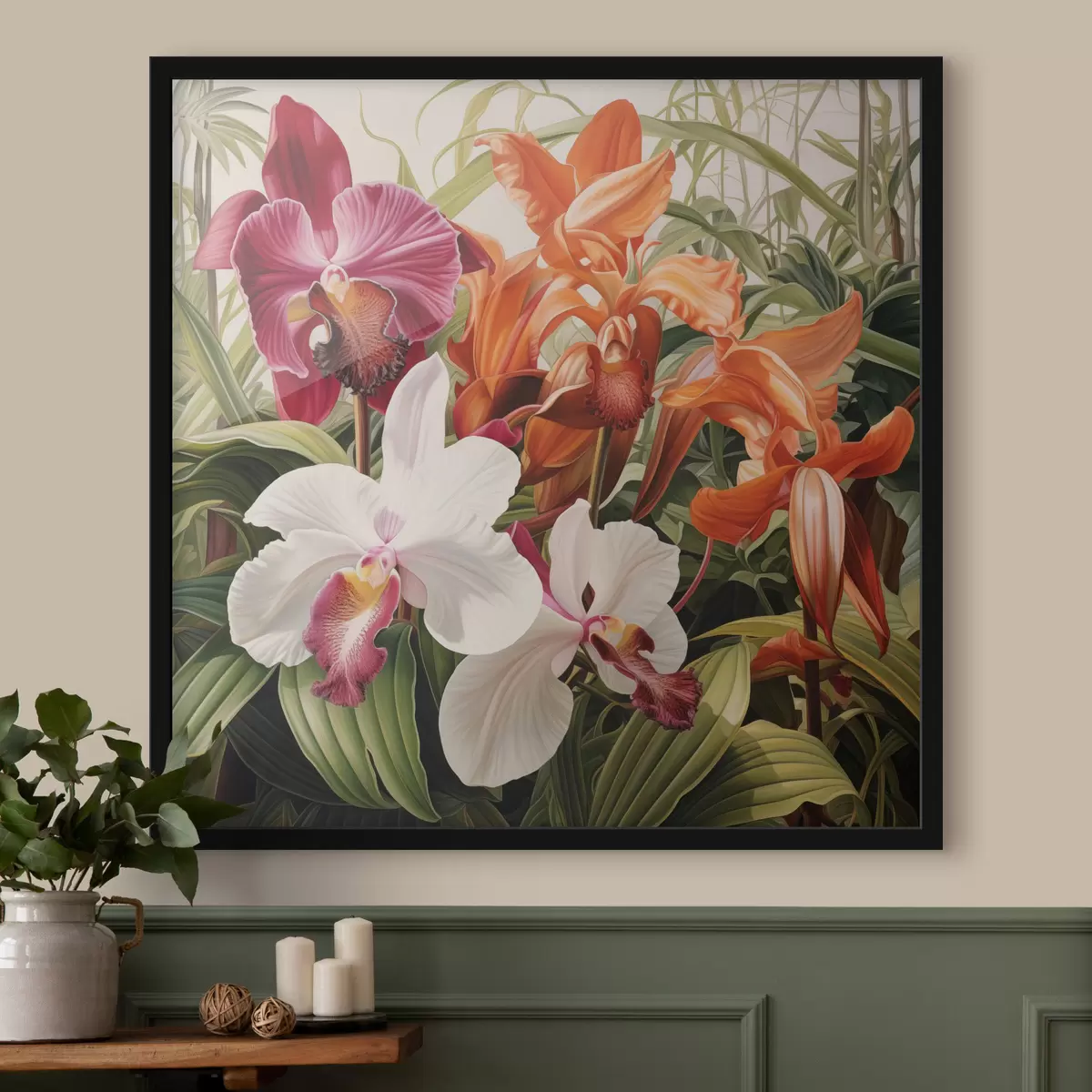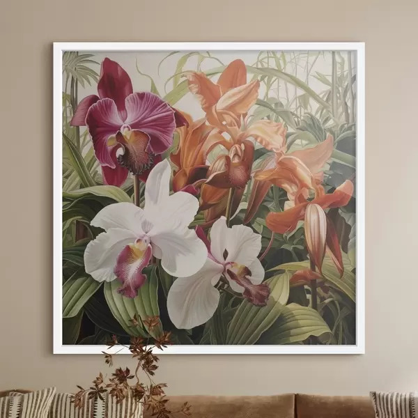 Poster Bouquet di fiori tropicali, orchidee con fogliame verde sullo sfondo Nr f48386