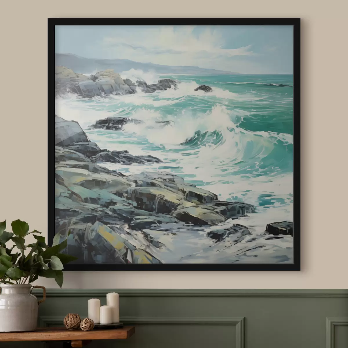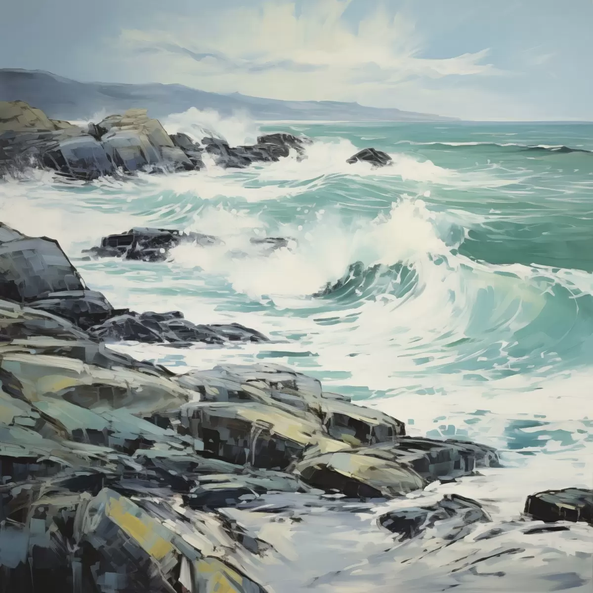 Poster Un paesaggio costiero roccioso con onde sotto un cielo nuvoloso, in stile pittorico f48388