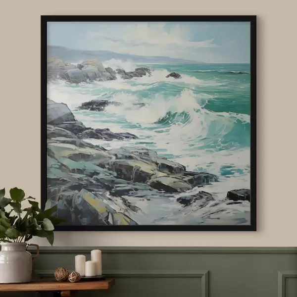 Poster Un paesaggio costiero roccioso con onde sotto un cielo nuvoloso, in stile pittorico Nr f48388