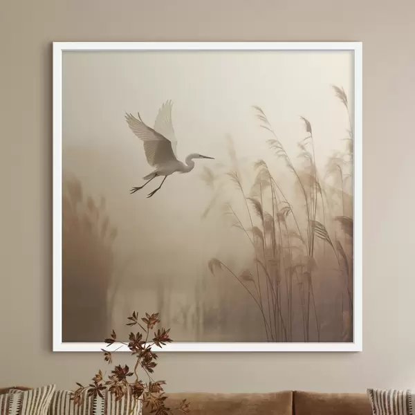 Poster Un airone bianco vola sopra un lago, circondato da alti canneti e alberi sullo sfondo Nr f48390