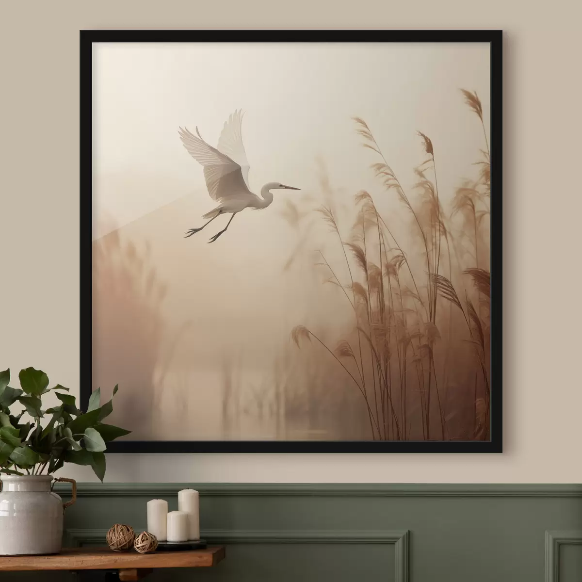 Poster Un airone bianco vola sopra un lago, circondato da alti canneti e alberi sullo sfondo f48390