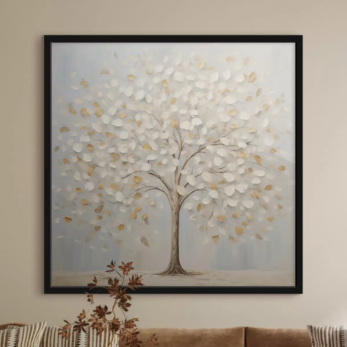 Poster Un dipinto dal tratto materico raffigurante un albero con foglie bianche e gialle su uno sfondo azzurro f48391
