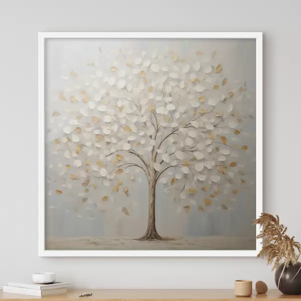 Poster Un dipinto dal tratto materico raffigurante un albero con foglie bianche e gialle su uno sfondo azzurro Nr f48391