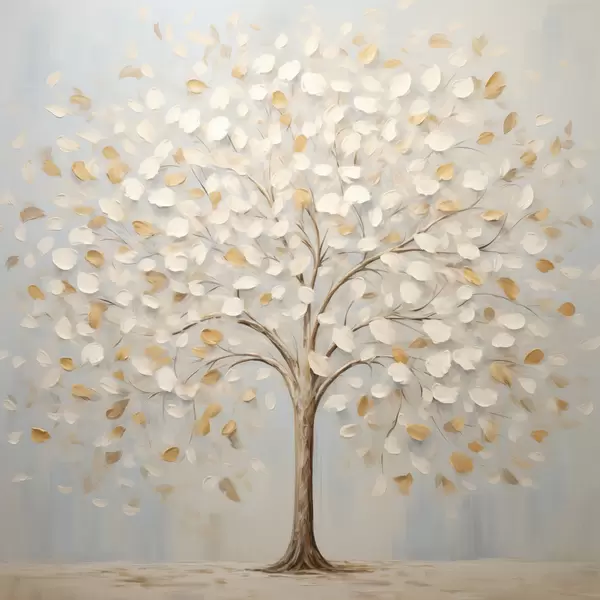 Poster Un dipinto dal tratto materico raffigurante un albero con foglie bianche e gialle su uno sfondo azzurro f48391