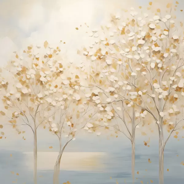 Poster Uno stile pittorico materico che raffigura alberi con foglie bianche e gialle su uno sfondo azzurro f48392