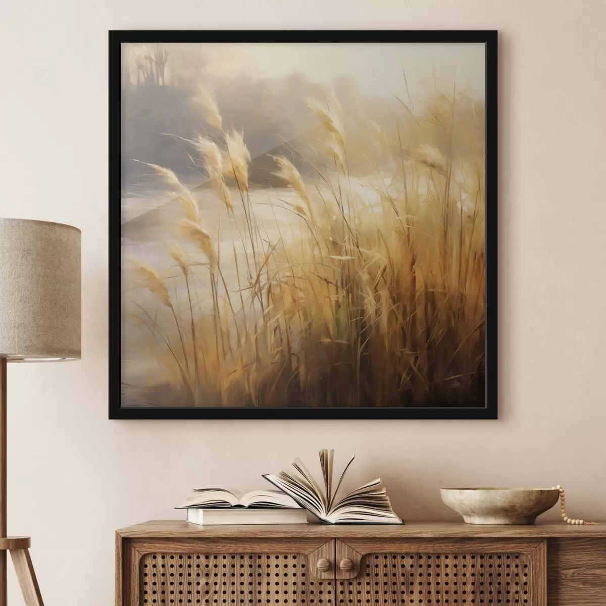 Poster In primo piano, erba alta e secca con spighette; sullo sfondo, un lago e degli alberi Nr f48394