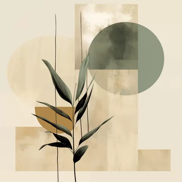 Poster Una pianta di colore verde scuro con forme geometriche astratte e texture acquerellate nei toni del beige e del verde Nr f48409